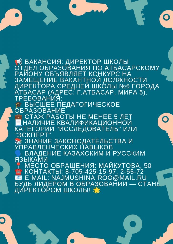 Атбасар ауданы бойынша білім бөлімі Атбасар қаласының №6 орта мектебі директорының бос лауазымына орналасуға конкурс жариялайды (мекен-жайы: Атбасар қ., Мира 5).