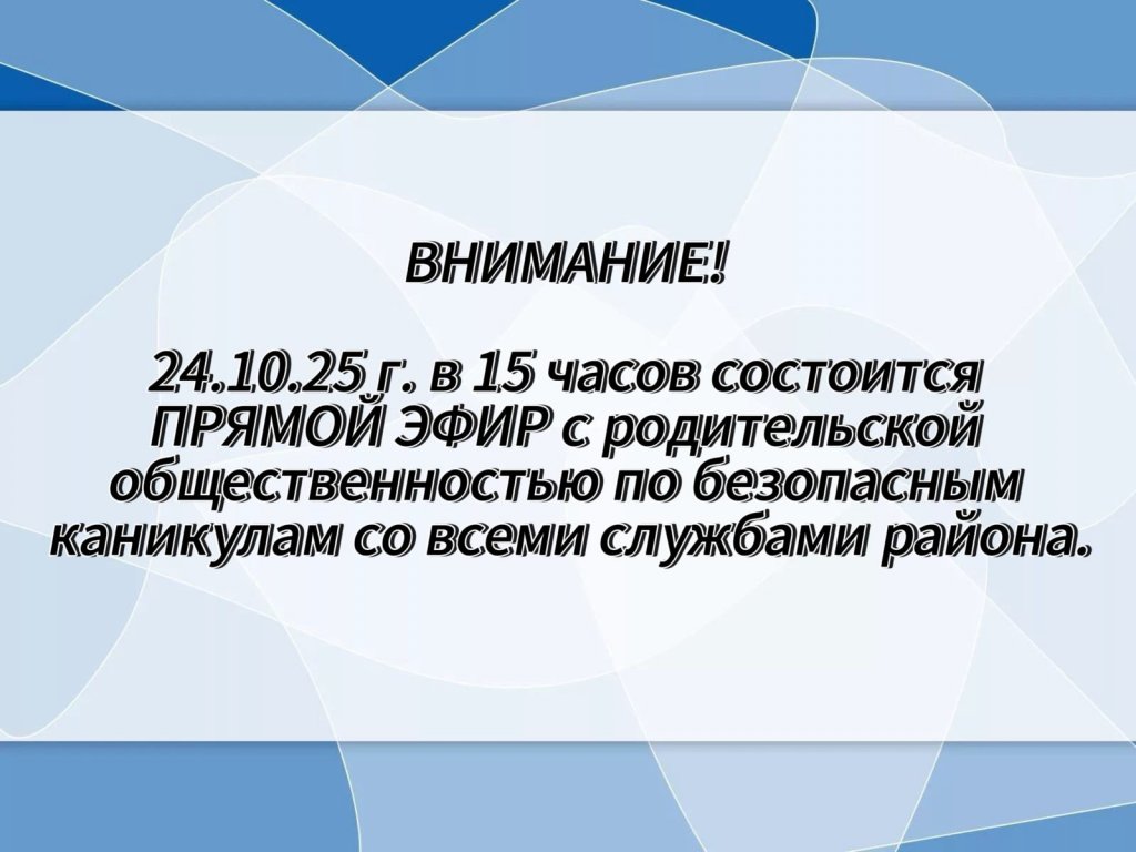 Назар аударыңыз! 24.10.25 ж.сағат 15-те ауданның барлық қызметтерімен Қауіпсіз демалыс бойынша ата-аналар жұртшылығымен тікелей ЭФИР өтеді.