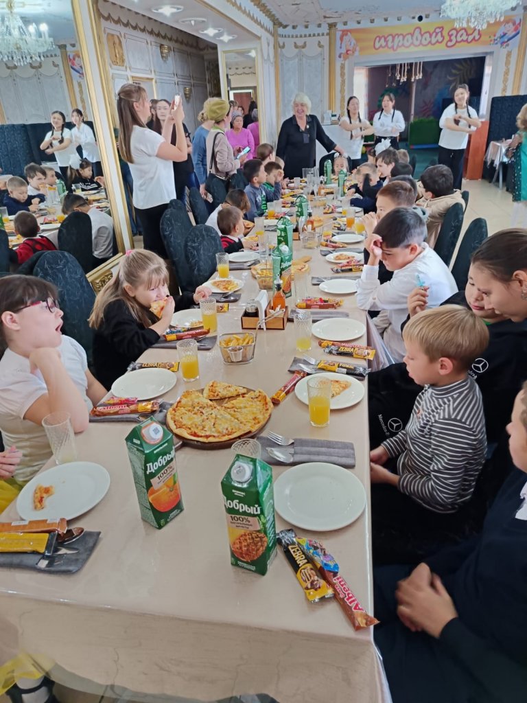 «Мангал» кафесінің иелері ыстық түскі ас ұйымдастырды, онда балалар барлығына ұнайтын пицца, фри және наггетстерден дәм тата алды. Кафе иесі және «Азия» сауда үйінің жеке кәсіпкері Рахметова Динара Серікқызының тәттілері балаларға жылулық, күлікі мен қолдауға толы керемет күнді еске қалдырды.