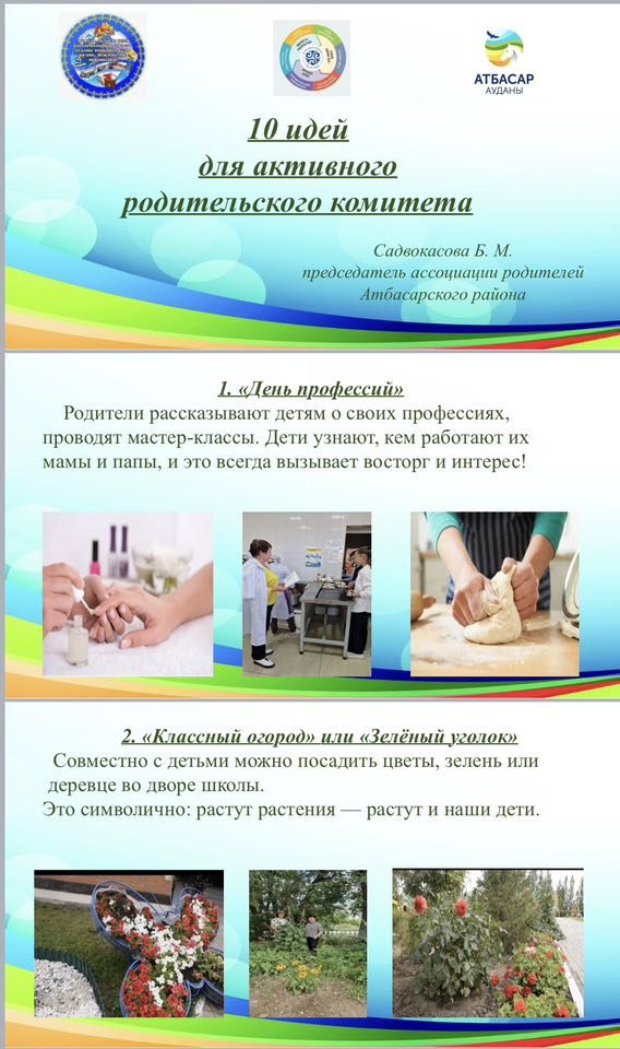 Оқушылармен табысты оқу және тәрбие іс-әрекетінің КЕПІЛІ сынып жетекшісінің ата-аналармен ынтымақтастығы болып табылады, өйткені отбасы баланың жеке басының даму процесіне үлкен әсер етеді. Демек, ата – аналарды педагогикалық процестің белсенді қатысушылары ету маңызды және жауапты міндет болып табылады. Сондықтан ата-аналармен жұмыс тәрбие жұмысында маңызды орын алады. Ата-аналарды оқу-тәрбие процесіне қалай тартуға болады? Бұл туралы Атбасар ауданы ата-аналар қоғамы кеңесінің төрағасы Баян Мыңжасарқызы Сәдуақасова "ата-аналар комитеттері кері байланыс және бастамалар платформасы ретінде" өңірлік кеңесінде онлайн-режимде сөз сөйлеп, "белсенді ата-аналар комитеті үшін 10 идеяны"ұсынды.