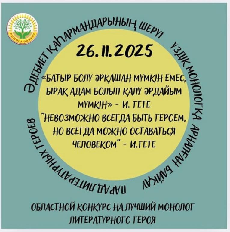 2025 жылғы 26 қарашада «Әдебиет қаһармандарының шеруі» облыстық байқауы қашықтықтан өтті. «Әдебиет қаһармандарының шеруі» әдебиет кейіпкерлердің үздік монологына арналған байқаудың лейтмотиві Гётенің «Әрқашан батыр болу мүмкін емес, бірақ әрқашан адам болып қала беруге болады» деген сөздері болды.