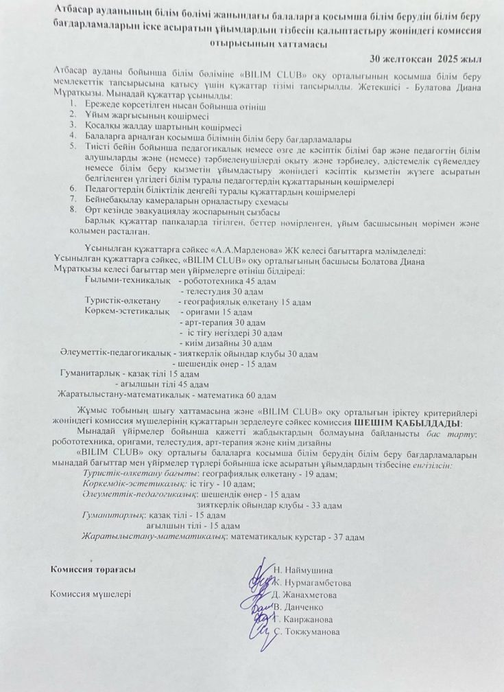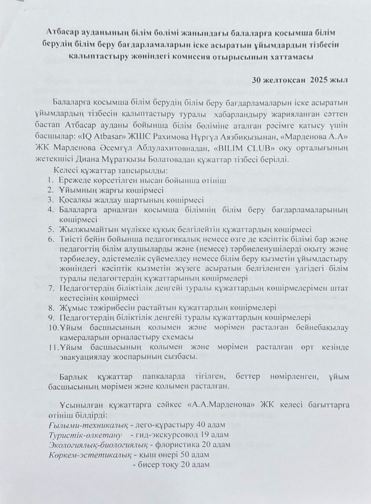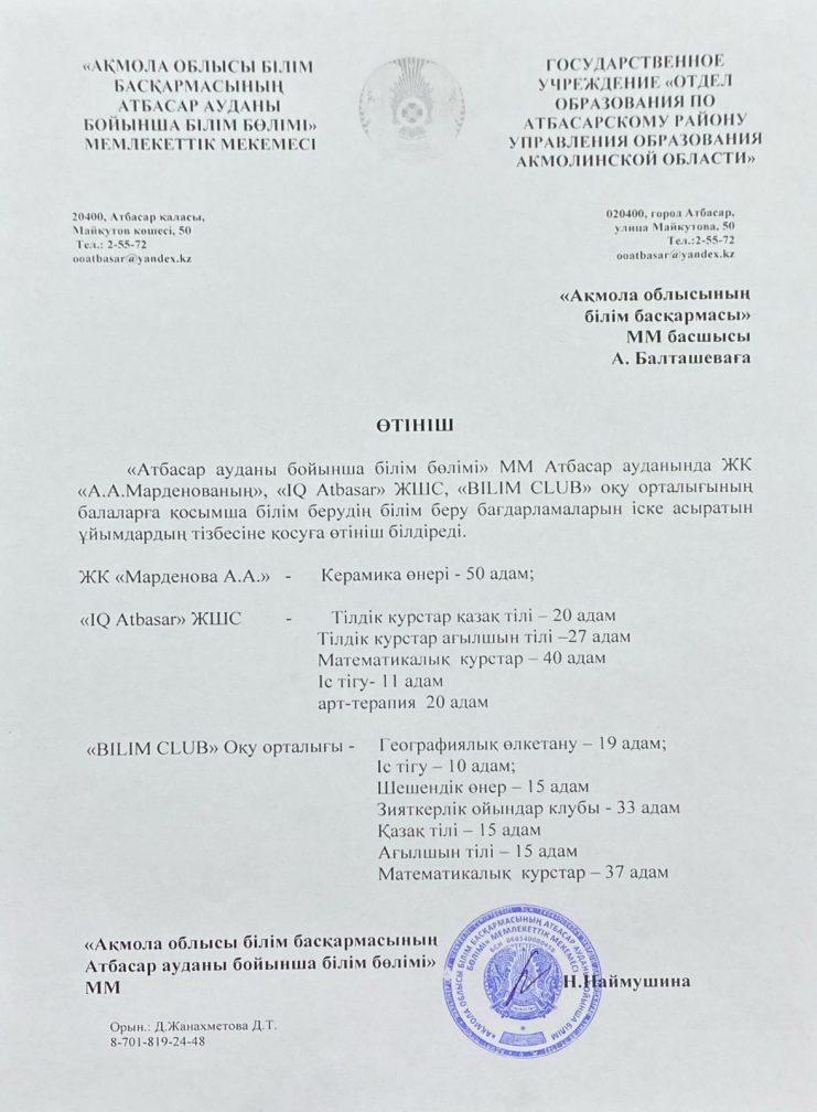 «АКМОЛА ОБЛЫСЫ БІЛІМ БАСКАРМАСЫНЫҢ АТБАСАР АУДАНЫ БОЙЫНША БІЛІМ БӨЛІМІ» МЕМЛЕКЕТТІК МЕКЕМЕСІ