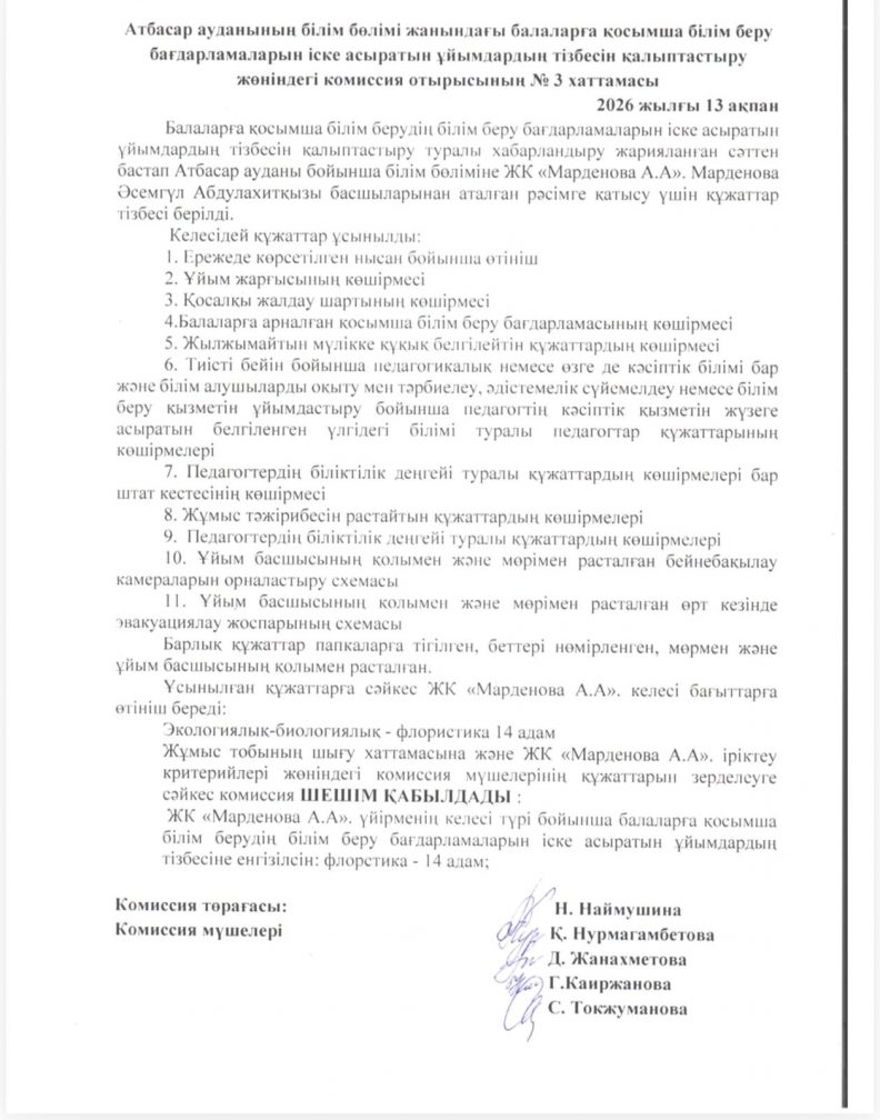 Балаларға қосымша білім берудің білім беру бағдарламаларын іске асыратын ұйымдардың тізбесін қалыптастыру жөніндегі комиссия отырысының № 3 хаттамасы.